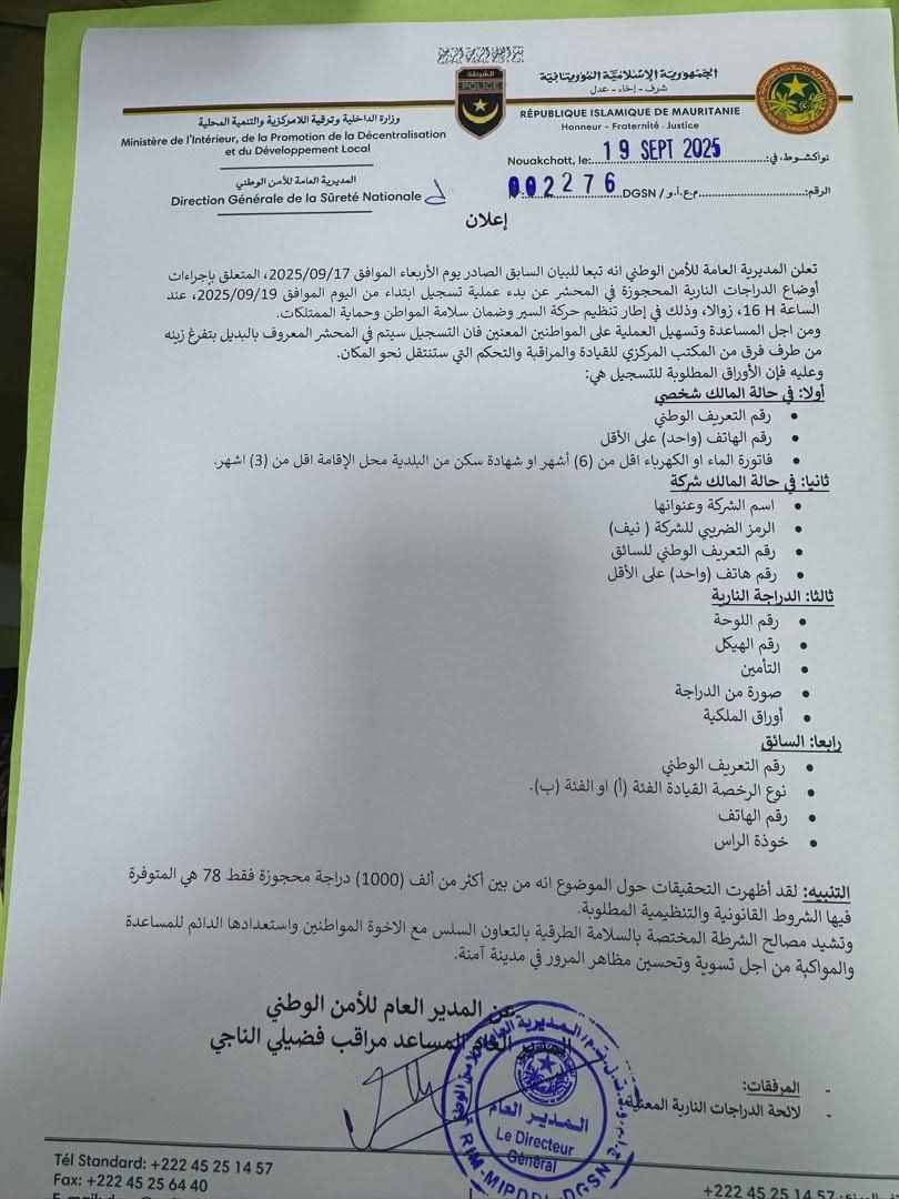 أعلنت المديرية العامة للأمن عن بدء عملية تسجيل الدراجات النارية المحجوزة في المحشر ابتداء من اليوم الموافق الـ19 سبتمبر 2025 عند الساعة الرابعة مساء.