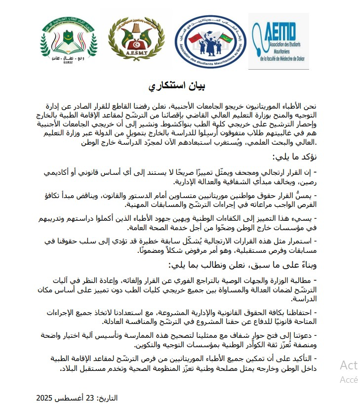 استنكر عدد من الأطباء الموريتانيين، خريجي الجامعات الأجنبية، حصر الترشح لمقاعد الإقامة الطبية بالخارج على خريجي كلية الطب بنواكشوط، معلنين رفضهم القاطع لهذا القرار الصادر عن طباء ينددون بإقصائهم من التخصص في الخارجإدارة