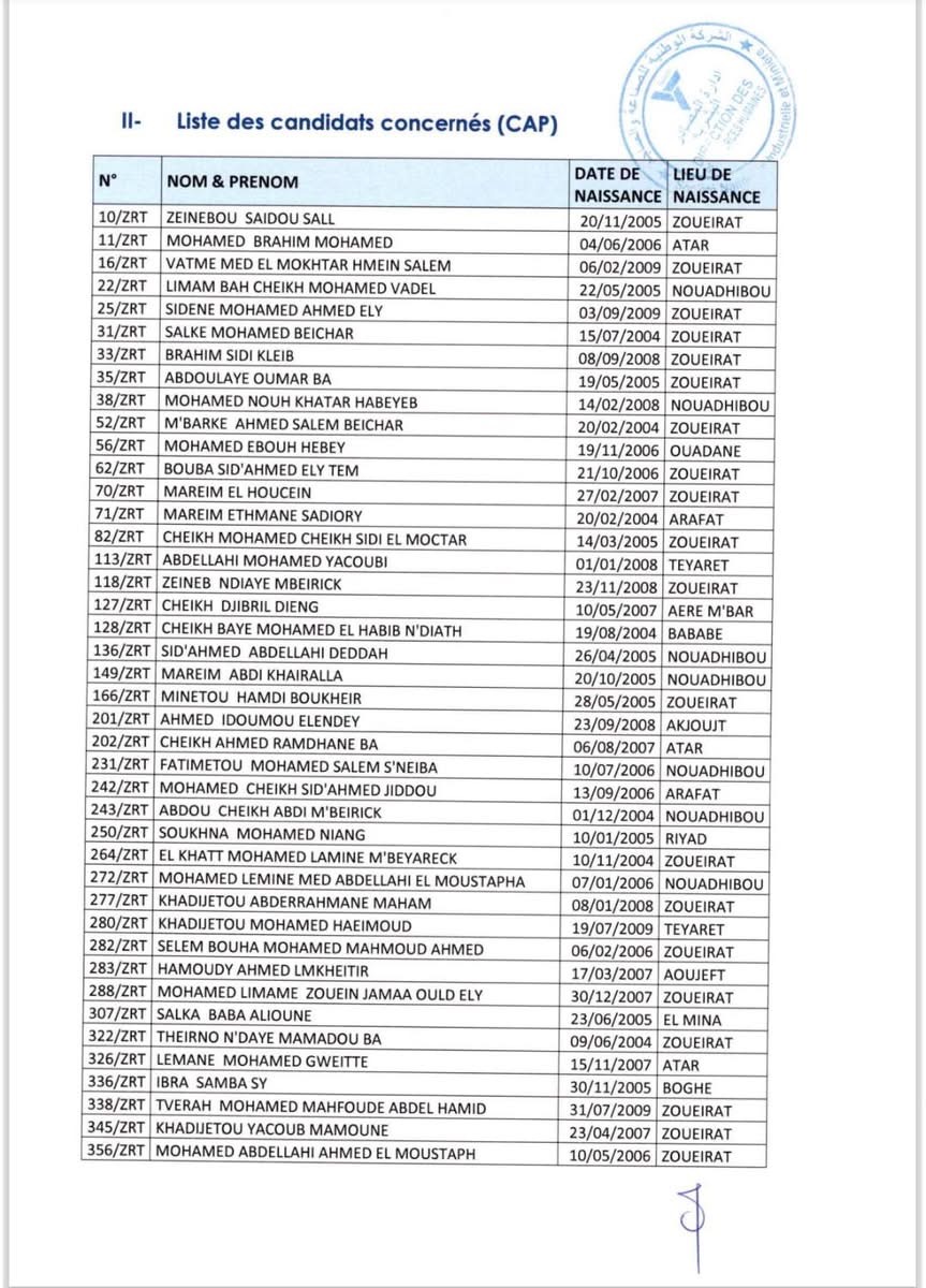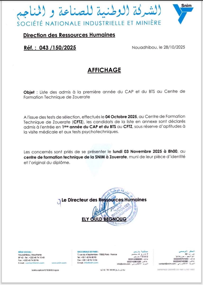ودعت ادارة المصادر البشرية المقبولين ضمن اللائحة إلى الحضور يوم 3 نوفمبر 2025، على تمام الساعة الثامنة صباحا ، إلى المركز مصحوبين ببطاقات تعريفهم وملفاتهم الأصلية ، لاستفاء شرط تجاوز الفحوص الطبية والاختبارات النفسية -التقنية .