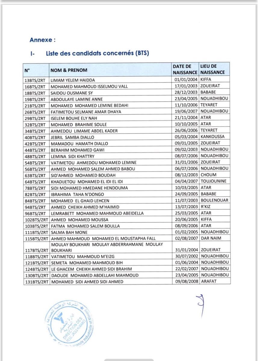 أصدرت إدارة المصادر البشرية بالشركة الوطنية للصناعة والمناجم (سنيم)، مساء اليوم الثلثاء، لائحة بأسماء المقبولين للتكوين في شهادة الكفاءة المهنية (Cap) و فني عالٍ (BTS) بمعهد التكوين التقني بازويرات