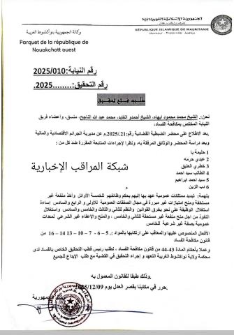 أحالت النيابة المختصة بمحاربة الفساد في ولاية نواكشوط الغربية، اليوم الثلاثاء، ملفًا يتعلق بشبهات فساد إداري ومالي إلى قاضي التحقيق المكلف بملفات الفساد، مطالبة بفتح تحقيق قضائي شامل وإيداع المتهمين السجن على ذمة التحقيق.