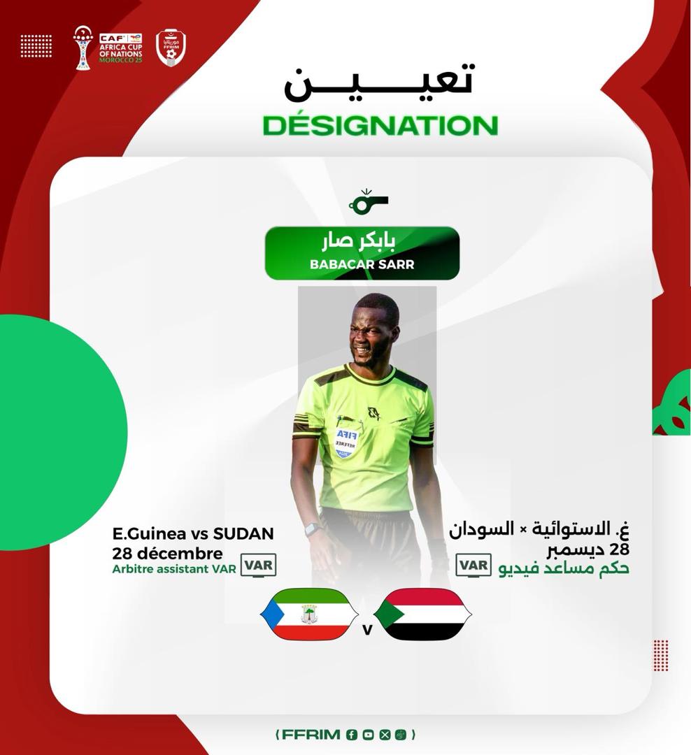 يشارك الحكم الدولي الموريتاني بابكر صار كحكم مساعد للفار (VAR) في مواجهة غينيا الاستوائية والسودان، ضمن الجولة الثالثة والأخيرة من دور المجموعات لكأس أمم إفريقيا "المغرب 2025".