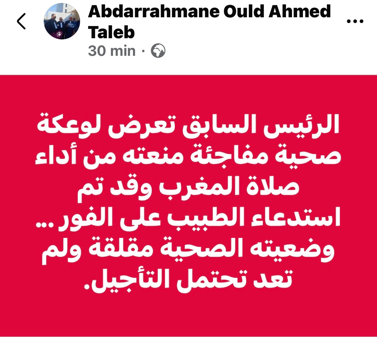 قال المحامي عبد الرحمن ولد زروق إن موكله الرئيس السابق محمد ولد عبد العزيز، تعرض لوعكة صحية مفاجئة، مساء اليوم الاثنين، منعته من أداء صلاة المغرب.