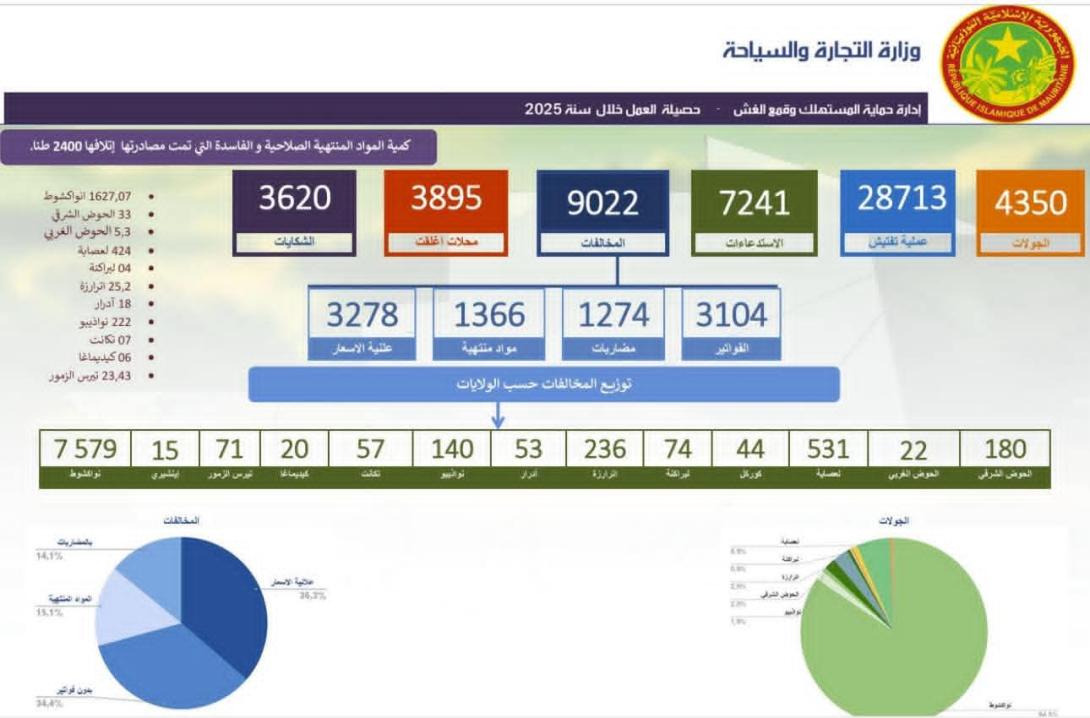 كشفت معطيات رسمية، صادرة عن وزارة التجارة والسياحة، عن تنفيذ 4350 جولة تفتيش داخل الأسواق، أسفرت عن 28713 عملية تفتيش شملت المحلات التجارية والمجازر والمجمعات التجارية والمخابز، وذلك في إطار جهود تعزيز الرقابة وحماية المستهلك.