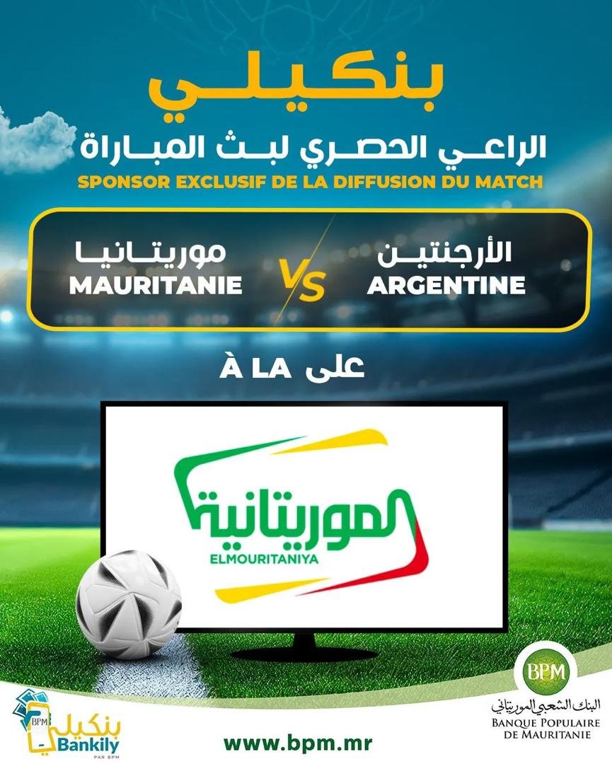 أعلن تطبيقُ "بنكيلي" التابع للبنك الشعبي الموريتاني، رعايته الرسمية والحصرية لبث المباراة الودية التاريخية التي تجمع المنتخب الوطني الموريتاني "المرابطون" بنظيره الأرجنتيني بطل العالم المقررة الليلة.
