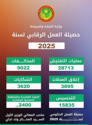 نشرت وزارة التجارة والسياحة، حصيلة عمل فرق حماية المستهلك للعام المنصرم، حيث قامت الفرق ب 28713 عملية تفتيش وقامت ب 15835 عملية تحسيس وتلقت الفرق 3620 من الشكايات .