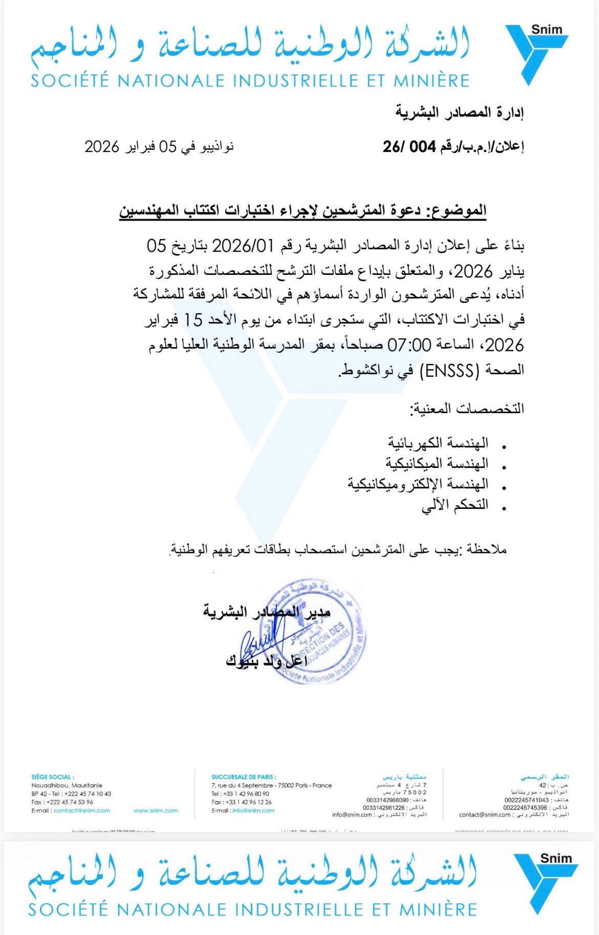 بناءً على إعلان إدارة المصادر البشرية رقم 01/2026 بتاريخ 05 يناير 2026، والمتعلق بإيداع ملفات الترشح للتخصصات المذكورة أدناه، يُدعى المترشحون الواردة أسماؤهم في اللائحة المرفقة للمشاركة في اختبارات الاكتتاب، التي ستُجرى ابتداءً من يوم الأحد 15 فبراير 2026، الساعة 07:00 صباحًا، بمقر المدرسة الوطنية العليا لعلوم الصحة (ENSSS) في نواكشوط.