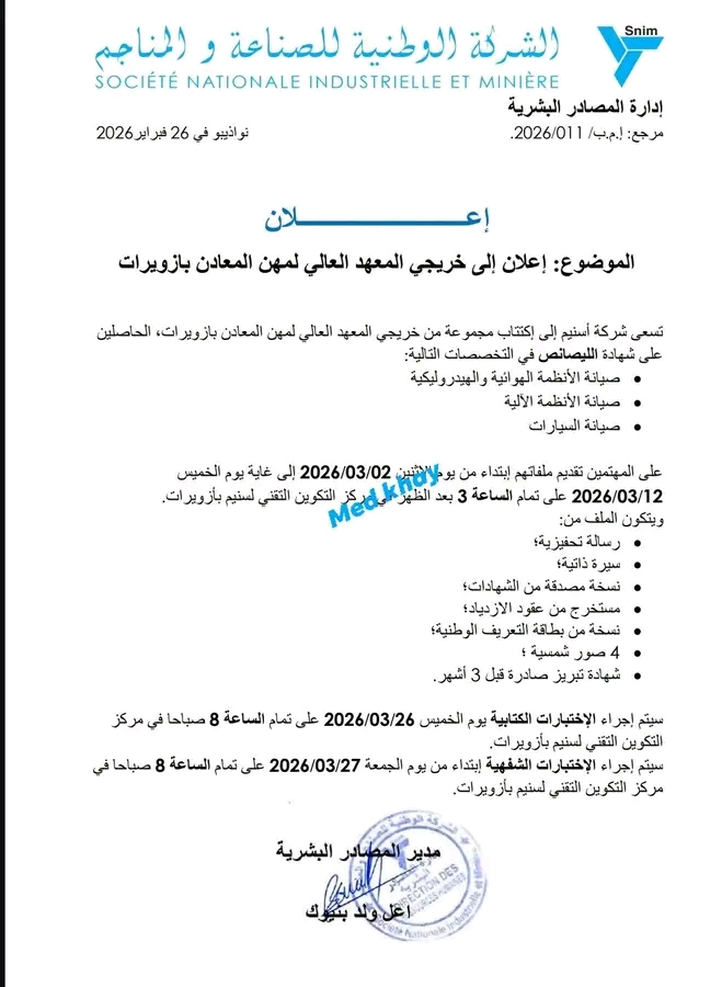 تعلن شركة أسنيم عن فتح باب الاكتتاب أمام خريجي المعهد العالي لمهن المعادن بازويرات (IS2M) الحاصلين على شهادة الليصانص في تخصصات: صيانة الأنظمة الهوائية والهيدروليكية، صيانة الأنظمة الآلية، وصيانة السيارات.
